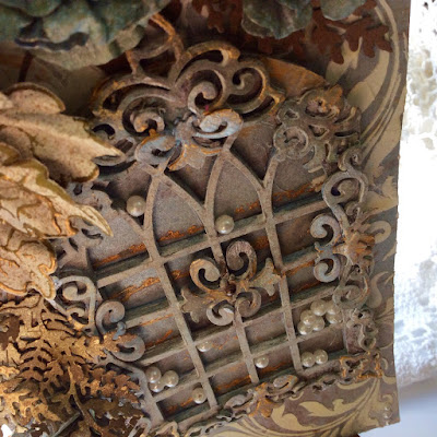 Le feuillage a été réalisé avec des decoupes Tatteres Lace et Cheery Lynn Designs Pair of Ferns - B 147 ) , et toujours sur carstock encré , et légerement parsemé de peinture acrylique or pour le feuillage mordoré.