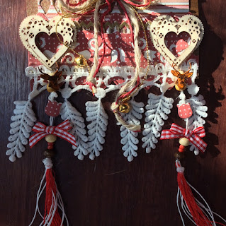 The lace, beads, small red and gold bells, wood chipboard, and ribbons are from my personal stock
